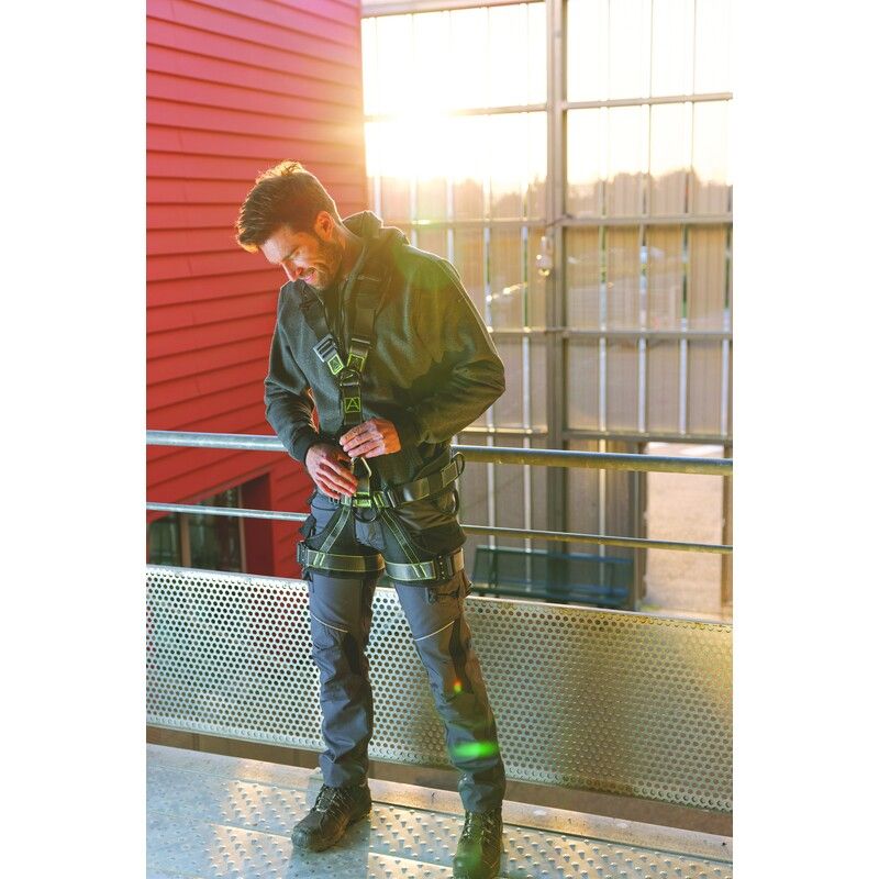 Technisch harnas met een nieuwe architectuur ontworpen om de ergonomie van touwwerkers te optimaliseren, uitgerust met een ventrale stijgklem
