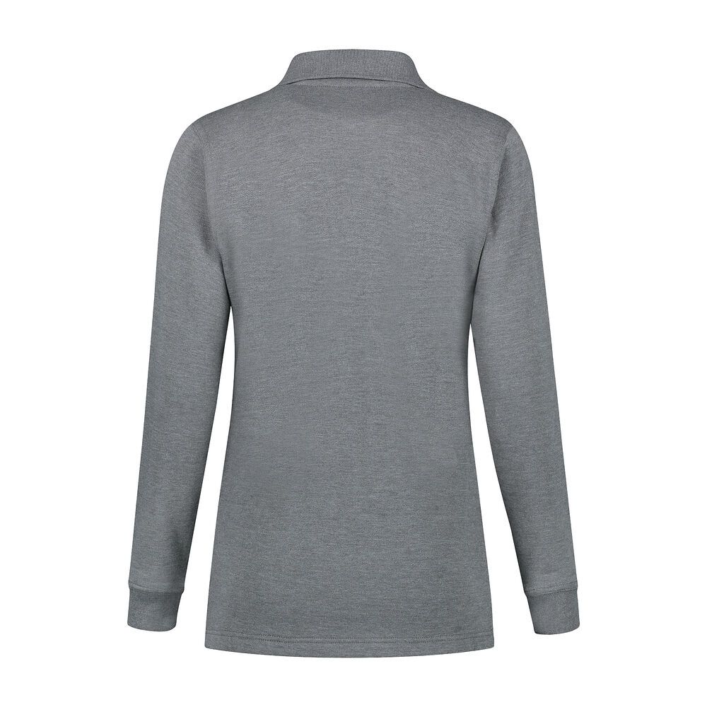 Polosweater, 50% katoen / 50% polyester, 280 gr/m², french terry met geruwde binnenzijde, ladies fit met polokraag, 2-knoopsluiting, mouw met ribmanchet en splitjes in zijnaad.